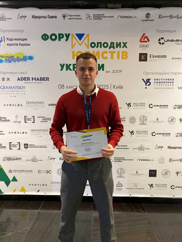 Кафедра кримінально-правових дисциплін і судочинства вітає здобувача освітньої програми «Інтелектуальна власність» Артема Кристка, який став лауреатом Всеукраїнського конкурсу «Молодий правник року» 2024/2025у номінації «Студент-правник» та взяв участь у Форумі молодих юристів України.