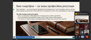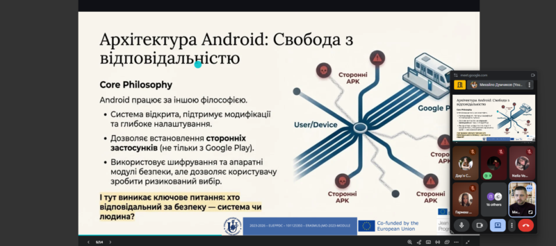 Михайло Думчиков наголосив на зростаючій проблемі кіберзлочинності, пов’язаної з використанням смартфонів. Зокрема, було розглянуто такі актуальні загрози, як фішингові атаки, шкідливе програмне забезпечення, витік персональних даних через вразливості операційних систем та ризики використання сторонніх додатків. Лектор також звернув увагу на відмінності в архітектурі безпеки iOS та Android, пояснивши, чому закрита екосистема Apple забезпечує вищий рівень контролю, тоді як відкритість Android надає більше можливостей для налаштування, але водночас створює додаткові ризики.
